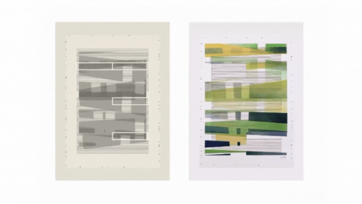 The collection by @Anna___Beller and @ratchitect is a captivating collaboration that explores the fusion of generative and intuitive art, blurring the lines between the digital and physical worlds, as well as the realms of robotics and human creativity. The creative journey of Alejandro and Anna encompasses coding, digital curation, pen-plotting, physical taping, and spraying, forming a dynamic interplay between artists and machines that delves into the realm of vectors. Alejandro’s generative algorithm and vector arrangement curation tool establishes a foundation of hatches and rectangles on an underlying grid. Anna then selects 53 iterations, meticulously refining the details, which Alejandro translates onto paper, setting the stage for the next phase. By connecting the vectors’ start and end points in preset steps, Anna seamlessly merges the digital and physical, resulting in an extraordinary painting born from the arrangement of vectors. The remarkable aspect lies in the dance between generative algorithms and Anna’s intuition, where her responses to the algorithm guide its completion. This captivating interplay exists within the In-between Realm, the narrow borderline where subjectivity and objectivity converge. “Draftwerk” invites contemplation of the delicate balance between the digital and physical, showcasing the beauty that emerges when human and machine creativity intertwines. Explore this harmonious coexistence of subjectivity and objectivity at our website!